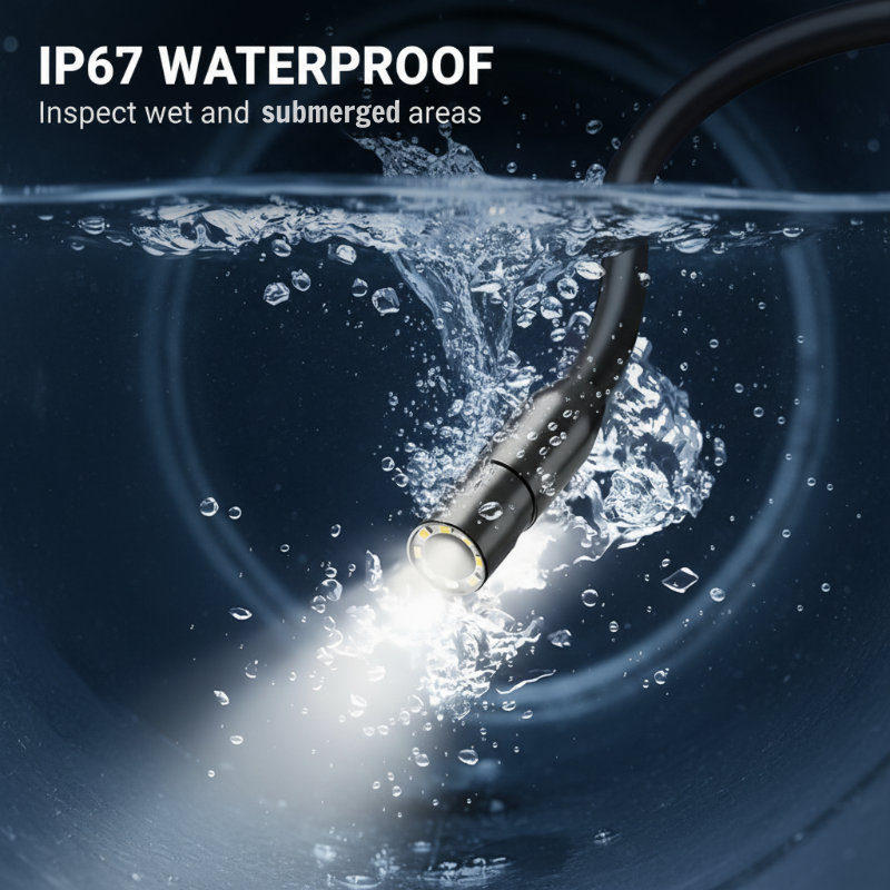 CONCEPTION ROBUSTE ET ÉTANCHE IP67- La sonde de caméra bénéficie d'un indie d'étanchéité IP67, ce qui lui permet de fonctionner de manière fiable dans des conditions humides ou immergées. Cette durabilité garantit des performances constantes dans des environnements liquides difficiles, ce qui la rend idéale pour les inspections de plomberie et aquatiques..