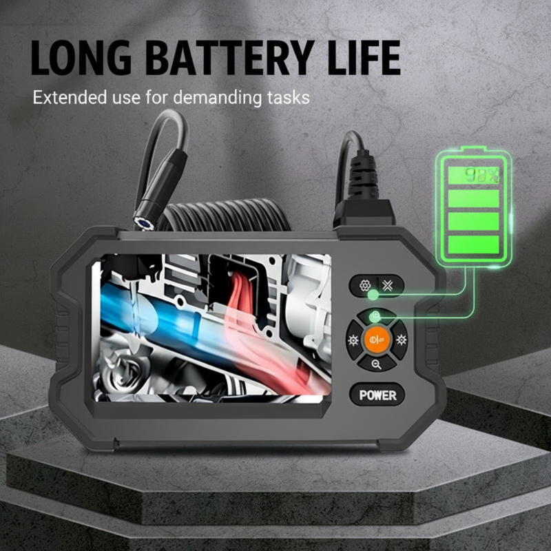 AUTONOMIE PROLONGÉE- Équipé d'une batterie haute capacité, cet endoscope offre une autonomie prolongée pour les tâches d'inspection approfondies. Vous pouvez effectuer des examens complets sans avoir à le recharger fréquemment, ce qui améliore l'efficacité et réduit les interruptions pendant les travaux critiques..
