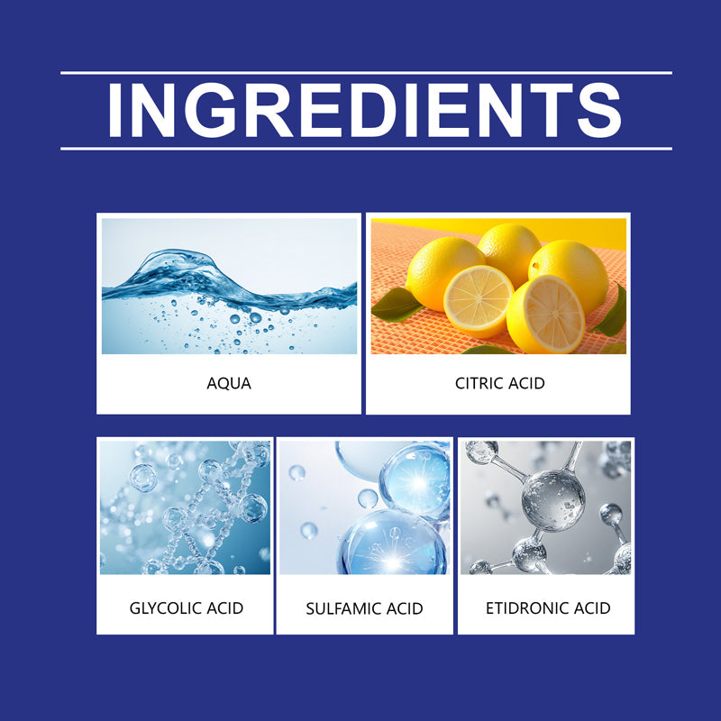 Ingrédients principaux : eau, acide citrique, acide amidosulfonique, acide glycolique, acide hydroxyéthylidène diphosphonique